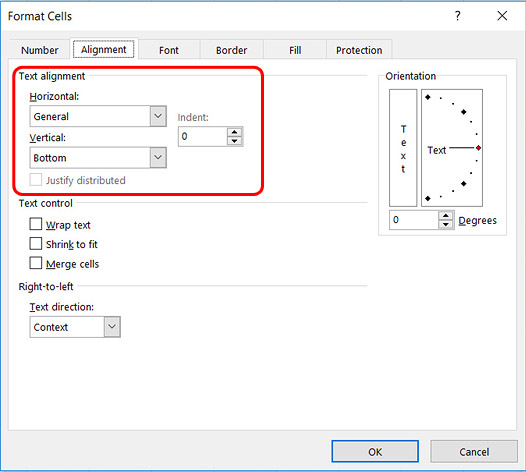 Next, go to the "Format Cells..." dialog box again, and change the orientations as shown below: