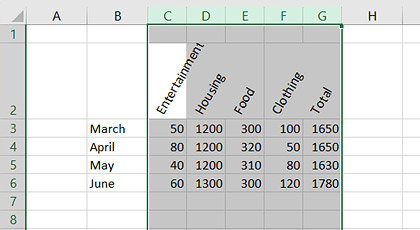 A special note: when cells have such a changed orientation, the text may "stick out" the side a little. You must keep in mind that even if the text sticks out, cell selection is about choosing the original cells space, and not the places where the text or the slanted cell areas appear. This is true any time you select a cell with overflow text.