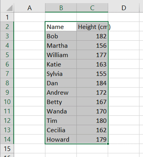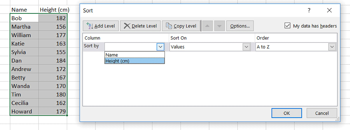 In the "Sort" dialog box, you may note that the button at top right, labeled "My data has headers," is checked. If you look back at the table cells, you will see that this has caused the Name and Height label cells to be deselected. You should check this status every time you sort; if you did not select the headers originally, checking the box will remove the first line of data. If you selected the headers but the box is not checked, then the header text will be sorted to the middle of the table.