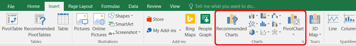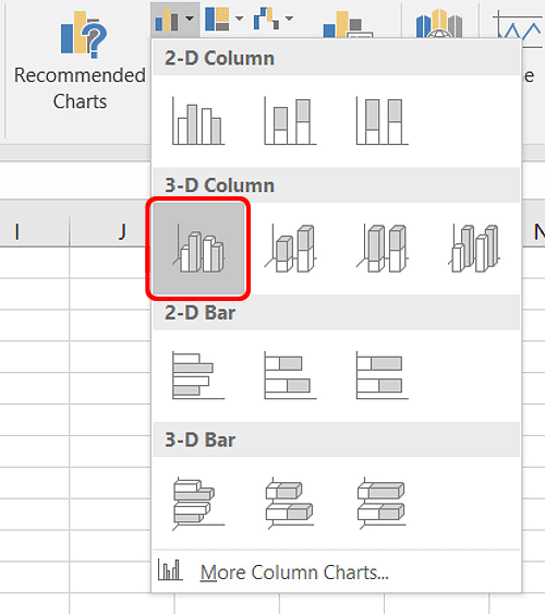 See the "Charts" area towards the right, the one with the large button titled "Recommended Charts" folowed by an array of small chart buttons? Click on "Column."—the small button at the top left of the array of small buttons. You will see these choices: