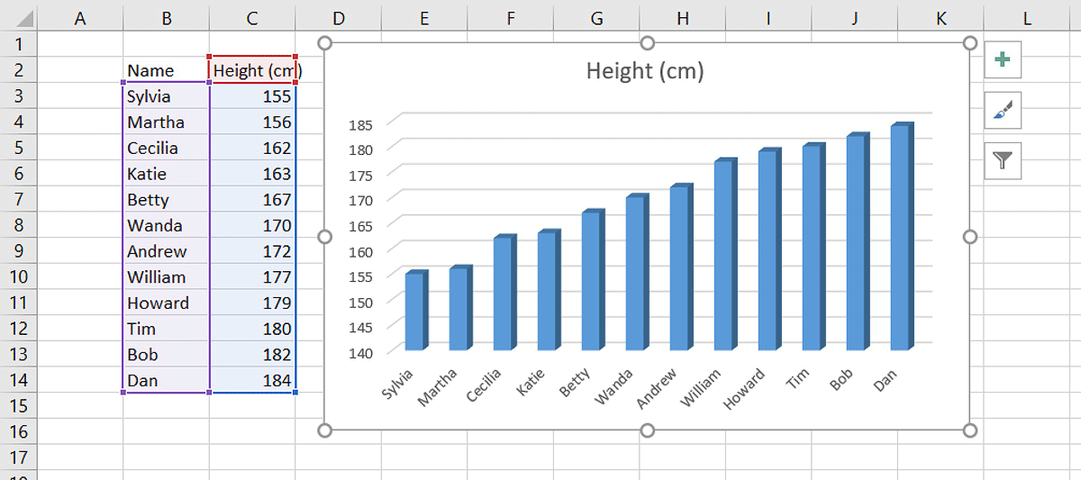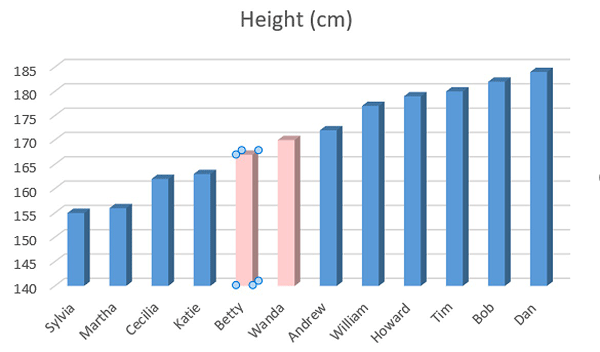 Notice that the chart does not yet clearly show that there is a difference in gender. You would have to carefully read each name at the bottom to see the distinction. Let's change the color of some columns to clear that up. First, click on the columns in the chart: