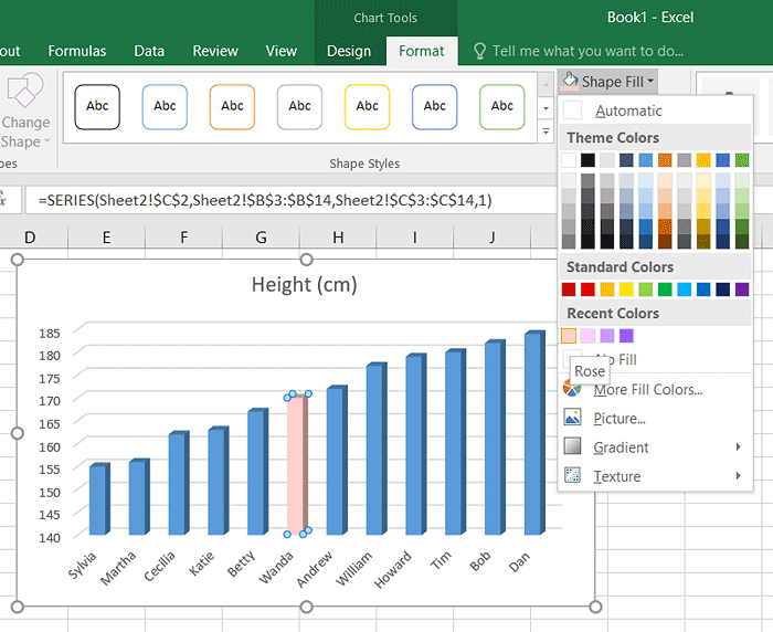 Note that now only Wanda's column is selected. Now, go to Chart Tools: Format, go to the Shape Fill menu, and select a pink color (or whatever gender-appropriate color you desire):